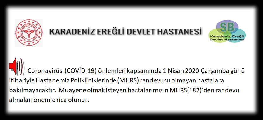 Koronavirüs (COVİD-19) önlemleri kapsamında 1 Nisan 2020 Çarşamba günü itibariyle Kdz.Ereğli Devlet Hastanesi Polikliniklerinde (MHRS) randevusu olmayan hastalara bakılmayacağını açıkladı. Muayene almak isteyen hastaların MHRS 182'den randevu almaları istendi.