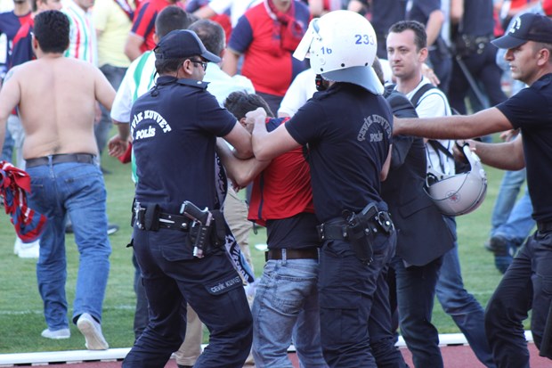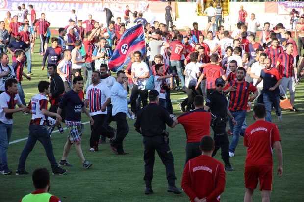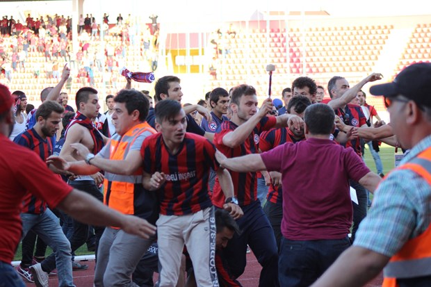 Zonguldaklı taraftarlar, Kızılcabölük taraftarlarının bulunduğu tribün önüne geldiğinde ise gerginlik yaşandı.Taraftarlar birbirlerine karşılıklı olarak bazı maddeler fırlatırkenT, araya giren polis ekipleri taraftarları yatıştırdı.Zonguldaklı taraftarların saha içerisinden çıkarılmasının ardından kupa törenine geçildi.