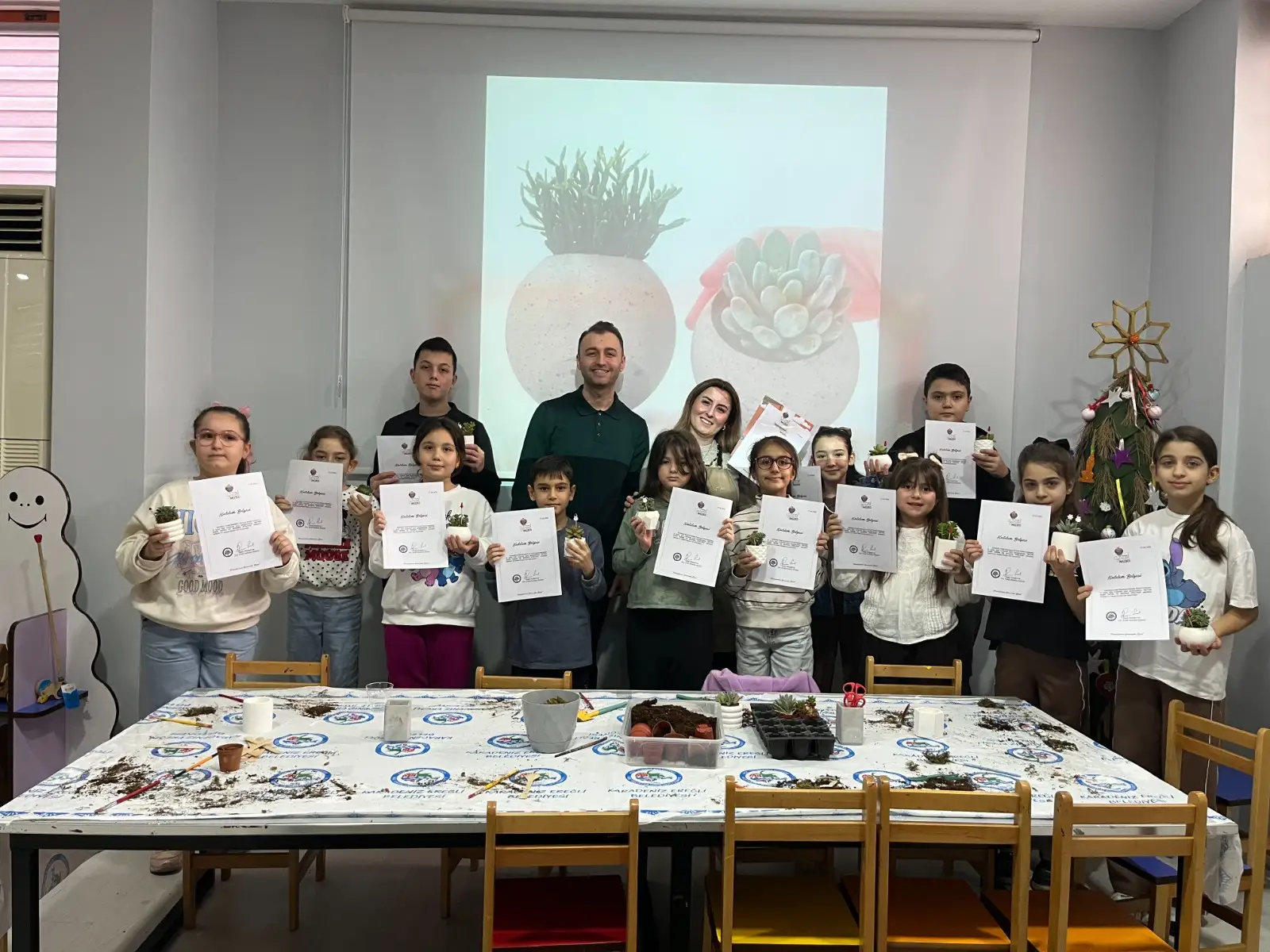 Kendi saksılarını tasarlayıp bitkilerini diken çocuklar, eğlenerek öğrenmenin mutluluğunu yaşadı. Etkinliğin sonunda çocuklara katılım belgeleri ve yaşayan kalemler hediye edildi; hatıra fotoğrafı çekiminin ardından atölye sona erdi.