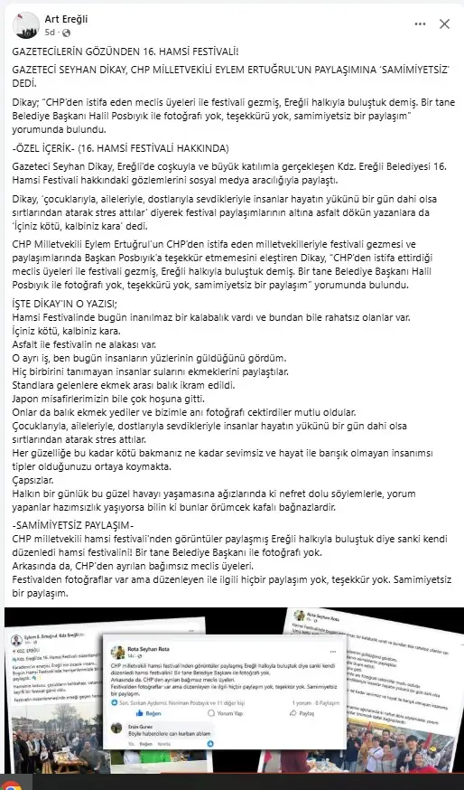 CHP Milletvekili Eylem Ertuğrul’un CHP’den istifa eden milletvekilleriyle festivali gezmesi ve paylaşımlarında Başkan Posbıyık’a teşekkür etmemesini eleştiren Dikay, “CHP’den istifa ettirdiği meclis üyeleri ile festivali gezmiş, Ereğli halkıyla buluştuk demiş. Bir tane Belediye Başkanı Halil Posbıyık ile fotoğrafı yok, teşekkürü yok, samimiyetsiz bir paylaşım” yorumunda bulundu.